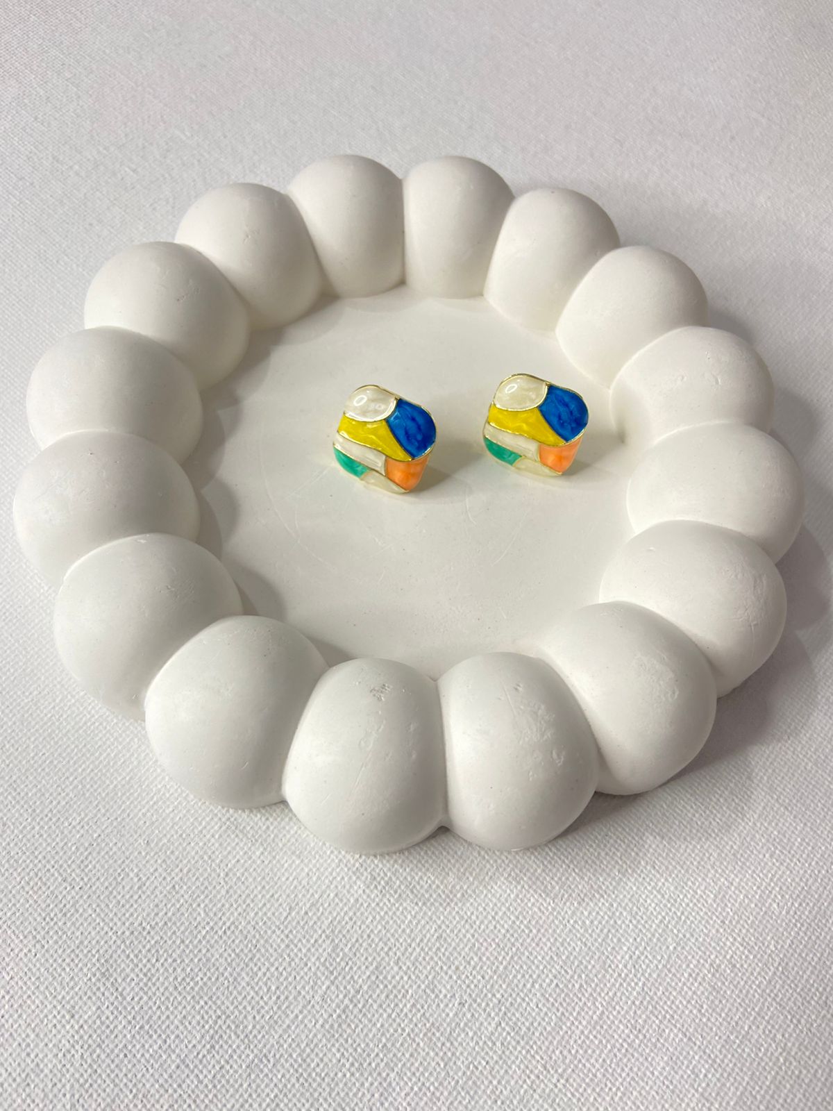 Brighten up your look with these playful yet elegant Golden Square Multicolor Enamel Earrings. Featuring a chic square shape adorned with bold enamel accents in blue, yellow, green, orange, and white, these earrings bring a fresh pop of color to any outfit.
